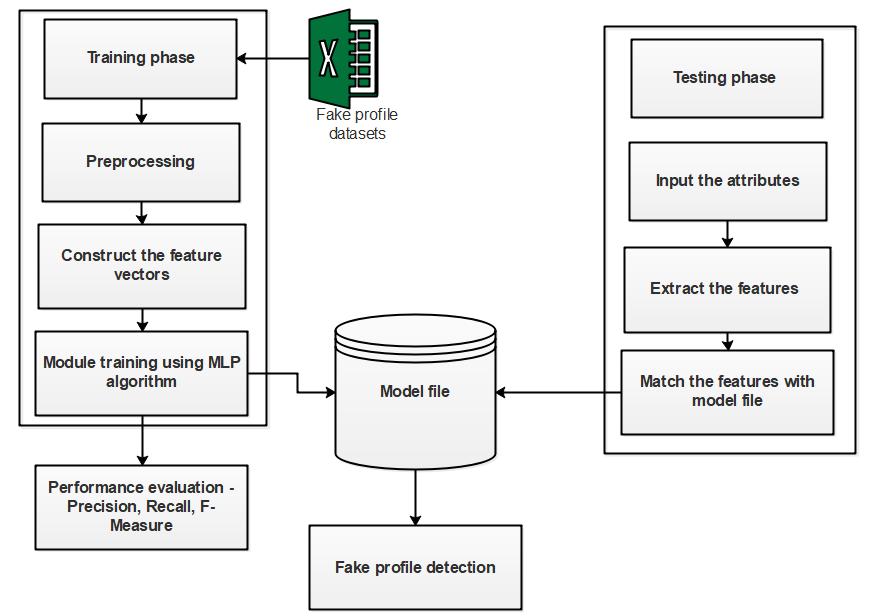 In today’s online social networks there have been a lot of problems like fake profiles, online impersonation, etc. To date,noonehascomeupwithafeasiblesolutionto these problems.Inthisproject,intendtogiveaframeworkwith whichtheautomaticdetectionoffakeprofilescanbedoneso thatthesocial lifeofpeople becomesecuredandbyusing thisautomaticdetectiontechniquewecanmakeiteasierfor thesitestomanagethehugenumberofprofilesusingMultilayer perceptron algorithm. Reduce the time complexity. Improvetheaccuracyinfakeprofiledetection.