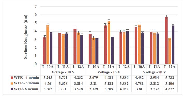 Since the pulse current and voltage increase, the machining rate increases with reference to wire feed rate and it results to improper finishing and shabby surface finish. Poor surface finish happens because of the presence of hardened reinforcement particles and they arehardtomachine.Whilemachining,theheatdeveloped throughsparkgenerationmeltsthematrixmaterialearlier thanthereinforcementparticlesasithasahighermelting point than the base aluminum matrix; such happenings would possibly result in protrusion of these reinforced particlesoutofthebasematerialandhencewilldefinitely resultinimpropersurface.