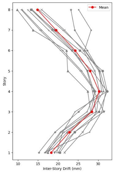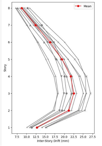 The relative displacement between stories plays a pivotal roleindeterminingthestructure'sfailurerate,makingita crucial metric for seismic performance assessment. Upon comparing the average maximum inter-story drift ratios (IDR) under both far and near-field ground motions, a significantdifferenceisevident.Specifically,themaximum inter-story drift is observed to be 30 mm, marking a 33 percentincreasecomparedtothe22.5mmrecordedunder far-field conditions. Additionally, the maximum story displacementis235mm,indicatinga46percentincreasein comparisontothe160mmobservedinthefar-fieldscenario. The drift pattern during a far-field earthquake exhibits a more uniform distribution with less variation among differentstories,signifyingaconsistentbehaviorthroughout thebuilding'sheight.Incontrast,thenear-fieldearthquake manifests a greater fluctuation in drift between stories, particularlyattheupperlevels.Thisobservationsuggestsa