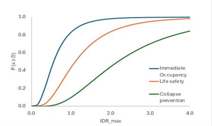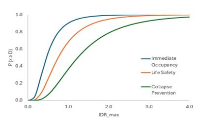 Upon the completion of the simulations and the determinationofthemaximumdisplacementatthetop of thestructureforeachgroundmotionrecord,theinitialstep involved the computation of fragility functions. This necessitatedthespecificationoflimitstatesthatcharacterize the performance of the structure. In order to assess the seismic damage states of the 8-story RC structure, the structural damage states were defined based on the allowable values of maximum inter-story drift ratios (IDRmax)of1.0%,2.0%,and4.0%.Thesevaluescorrespond totheperformancelevelsofImmediateOccupancy(IO),Life Safety(LS),andCollapsePrevention(CP),respectively.Itis worthnotingthatthelimitstatesweredescribedaccording to Table C1-3 in (FEMA 356) [9]. Subsequently, the provided formula was utilized to calculate the fragility function (BakerJW2015)[10], and the resulting plot is depicted in Figures 16(a) and 16(b). To enhance the practicalapplicabilityofthefragilityfunctions,itisadvisable to incorporate a more extensive set of ground motions, surpassing the 11 motions considered in this study. This approach ensures the development of reliable fragility functions,therebyfacilitatingaccurateseismicperformance andvulnerabilityassessments.