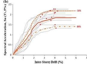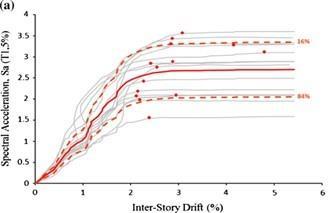 Nonlinear response history analysis (NRHA) proves valuableintheseismicassessmentofstructureswithinthe Incremental Dynamic Analysis (IDA) framework (VamvatsikosandCornell2004)[7].InIDA,theiterative application of NRHA involves employing a set of ground motions scaled to various factors, resulting in diverse responses at various levels of intensity are considered. Specifically,foranyparameterusedtodescribethestructural responseinengineering(knownasanEngineeringDemand ParameterorEDP)andameasureofintensity(referredtoas an IM), such as the 5% damped, first-mode spectral accelerationSa(T1,5%)(g),curvesknownasIncremental Dynamic Analysis (IDA) curves are created. These curves display the relationship between the EDP and IM for each record(asshowninFigure1).Traditionally,theEDP,which isthevariabledependentontheresponse,isplottedonthexaxis, while the IM, the independent variable representing intensity, is plotted on the y-axis. By examining these IDA curves,statistical distributions of response concerning the input can be illustrated using curves that depict the 16th, 50th, and 84th percentiles. (Fig. 14). The IDA curves and limit-statecapacitiesacrossallrecordscanbeconsolidated into 16, 50, and 84% fractiles based on the standard deviation (Fragiadakis and Vamvatsikos 2011) [8]. To enhance comprehension of the diverse effects of ground motion on numerical models, Figures 14(a) and 14(b) exhibitsseparateIDAcurvesandlimit-statecapacitiesacross allrecords.