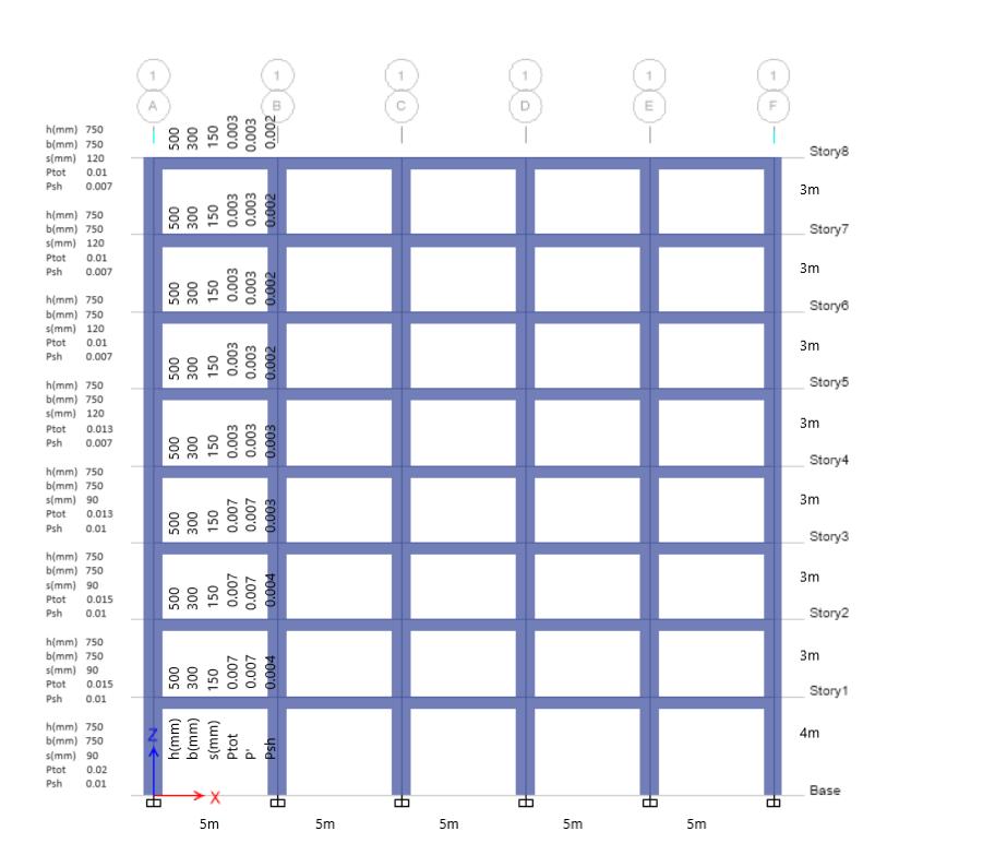 [9]and(ATC-40)[14]specified.Theseismicresponseofthe structureforhighermodesisnotconsideredasourstructure astheeffectofhighermodewillbeveryless.Thedamping ratio is kept 5% as specified in (IS-18932002) [12]. There havebeenmanyreportsontheinfluenceofgravityeffecton the calculated seismic response. In the present study, the effectofgravityloadsistakenintoaccount.Figure2depictsa structuralschematicofamulti-storybuilding,detailingthe reinforcement of its concrete members. The term "b" represents the width of beams or columns, shown as 750 mm."d"indicatestheirdepth,varyingbetween120mmand 90 mm. "s" refers to the spacing between longitudinal reinforcementbarswithinthemembers."Ptot"isthetotal percentageoflongitudinalreinforcement,and"Psh"denotes thepercentageofshearreinforcement,bothcriticalforthe structure's stability and seismic resilience. Figure 2 and 3 showselevationandplanviewofthemodelstructure.Figure 4isabackbonecurveforbeam/columninelasticplastichinge modelaccordingto(ASCE41-13)[15]