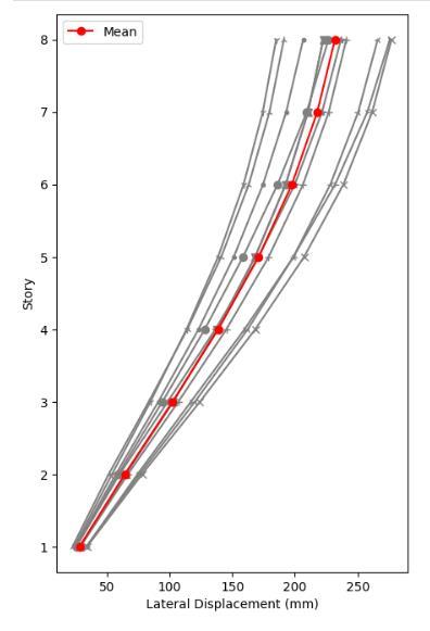 Herearetheoutcomesderivedfromtheanalysesperformed on building models exposed to near-field and far-field ground motions. The study employs incremental dynamic analysis,encompassingtheplottingandcomparisonoftotal storydisplacement,inter-storydrift(IDR),andIDAcurves. It'scrucialtounderscorethatthebuildingmodelundergoes scrutinyunderbothnear-faultandfar-faultgroundmotions, resultinginatotalof22nonlineartimehistoryanalyses.The seismicdemandparameterusedistheinter-storydriftratio, which signifies the displacement between adjacent floors divided by the story height. The nonlinear time history analysis reveals the results for an 8-story building model with a moment frame, showcasing the maximum lateral displacement under both near-fault and far-fault ground motions. It's noteworthy that far-fault motions generally entail consistent lateral displacement requirements. In contrast, near-fault conditions necessitate higher requirements.