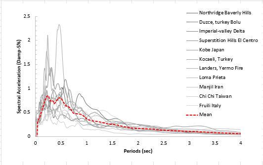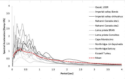 Eleventime-historyloadsofgroundmotionwereutilizedto account for the stochastic nature of the earthquakes. The datapertainingtotheloadingwasprovidedtoETABSinthe formofanaccelerationfile,whichincludedthestepsizeand thenumberofstepsalongthein-planehorizontalaxisofthe structure.Theverticalcomponentofthegroundmotionwas disregarded.ThedatawasprocuredfromthePEERdatabase [16].Theearthquakeswerechoseninsuchamannerasto guarantee that the records accurately represent intense motion capable of causing structural collapse (Fabrizio, Paolacci 2023) [17]. Furthermore, certain minimum thresholdswereimposedonthemagnitudeoftheevents,as wellasthepeakgroundvelocityandacceleration(C.Allin Cornell2006)[18].Thesethresholdswereselectedsoasto strikeabalancebetweentheselectionofsignificantmotions andensuringthatasufficientnumberofmotionsmeetthe selectioncriteria.