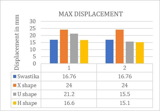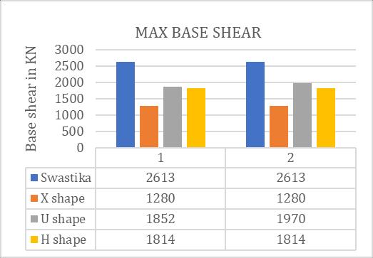 ItisclearfromexaminingthebaseshearvaluesinChart-3 thattheXshapemodelhaslowerbaseshearvaluesthanthe Swastika, H, and U shape models. Several factors, most notably the bigger area covered by the Swastika shape model,whichnaturallyresultsinhigherbaseshearvalues, might be blamed for this mismatch. Furthermore, the structuralarrangementforexample,theXshape'sCrossbar typemayaffectthebaseshearresults,makingvaluesappear smallerbecauseofthespecificconfiguration.Thesefindings highlight how crucial it is to consider structural