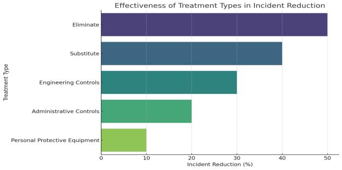 iv. Treatment Type Effectiveness: Analysis of the relative effectiveness of different types of safety measures, namely 'Eliminate', 'Substitute', 'Engineering Controls', 'Administrative Controls', and'PersonalProtectiveEquipment'.