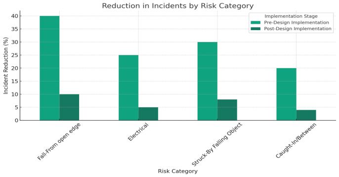 Table 2 provides the details regarding the Reduction in IncidentsbyRiskCategory."Fall-Fromopenedge"incidents show the most significant reduction when pre-design measures are implemented, with a 40% decrease. This indicatesthatwhensafetymeasuresareincorporatedduring theproject'searlyplanningstages,theriskoffallsfromopen edges is significantly mitigated. For Electrical incidents, implementingmeasuresduringthepre-designstageresults in a 25% reduction. A proactive approach to managing electrical hazards before finalizing the design is notably effective, though less so than in the case of fall-from-edge incidents.