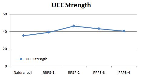 To find the unconfined compression strength and cohesive force developed on the soil with different proportions of powered Recorn - 3s. the UCC tests were conducted on natural soil and RRP3 samples, results of UCCtestswereshowninthefigure3