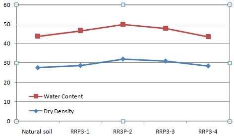 Proctor compaction tests were carried out on natural soil as well as prepared RRP3 samples. Variations in Optimum moisture content and maximum drydensityofRRP3samplesandNaturalSoilshowninthe figure2