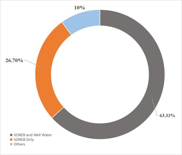 The primary sources of water provision in Cotonou consist of privately-owned home wells and the urban infrastructure operated by the SONEB national water corporation. A significant portion of the population utilises well water for the purposesoflaundering,dishwashing,bathing,andcleaning.Occasionally,thiswatersourceisalsousedfordrinkingdueto the insufficient presence of reliable water networks, unfavourable socioeconomic circumstances, and the limited availability of shallow groundwater (0.5 to 2m). There are various sources of water supply in Cotonou. Based on the study’sfindingsthesourcesofwaterfortheinhabitantsaredepictedinFigure3