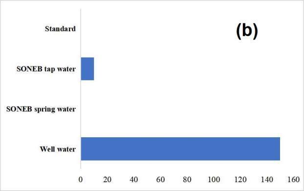 Figure 5 (a)Quantificationoffaecalcoliformlevelsinthewatersamples;(Source:Fielddata,Cotonou,Adandé,2021)(b) WaterandvegetableinE.Colisamples;(Source:Fielddata,Cotonou,Adandé,2021)