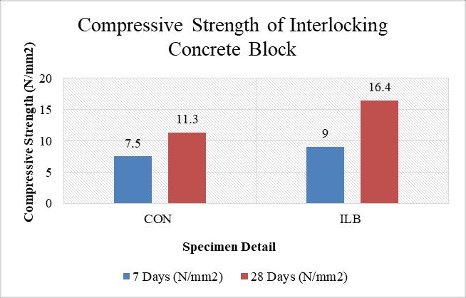 Fromthetable4thecompressivestrengthofInterlocking concreteblockwithoptimumpercentageofBrickWasteand optimumpercentageofplasticwastewhichwasdetermined from table 3 was casted and they were tested. In that the results of plastic waste and Brick Waste replaced interlockingconcreteblocksarecomparedalongside with thetestresultofconventionalconcrete.Accordingtowhich thereisaclearupsurgeinthecompressivestrengthinILB (10%ofplasticwastereplacementand4%replacementof Brick Waste) in both 7 days and 28 days compressive strengthascomparedwithConventionalConcrete(CON).