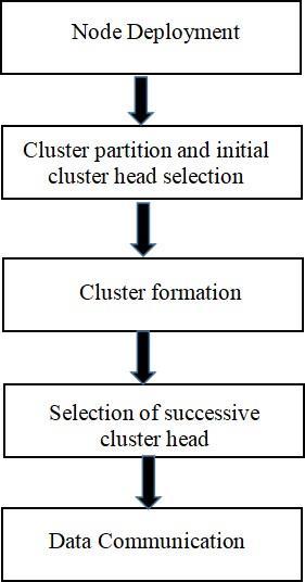 Here, first phase node deployment, after this phase initialization of cl-head takes place and it is the intermediate phase. And the one-third phase is cluster formation. In the forth phase selection of successive clhead takes place and finally in the fifth phase data communicationtakesanddatatransmitted.