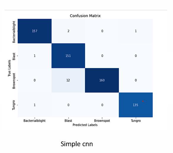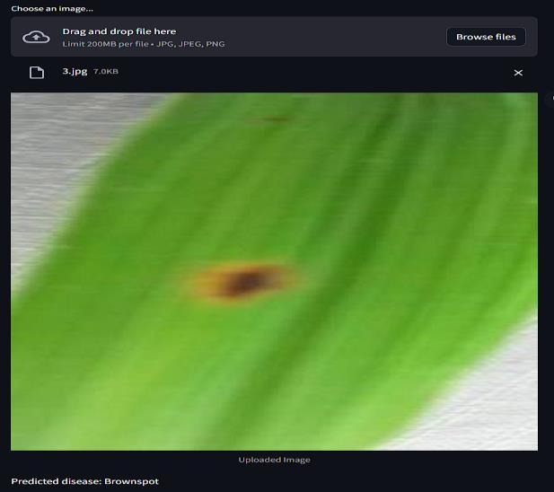 In conclusion, the integration of Convolutional Neural Networks(CNNs)inriceleafdiseasedetectionrepresentsa significantadvancementinagriculturaltechnology.Through rigorous experimentation and evaluation, our study demonstrates the superiority of deep learning techniques over traditional methods, achieving early and accurate disease detection. The deployment of a user-friendly frontend interface further enhances accessibility and usability for farmers, empowering them to manage rice diseases more effectively. Our project underscores the potentialofdeeplearninginprecisionagricultureandoffers apracticalsolutiontomitigatecroplosses.Movingforward, continued research in this field holds promise for further improvingcrophealthandagriculturalproductivity.