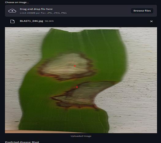 DeployedtheselectedmodelusingtheStreamlitlibraryto createauser-friendlyfrontendinterfaceforriceleafdisease classification. Integrated image uploading functionality to allowuserstouploadimagesforclassification.Preprocessed theuploadedimagesforpredictionbyresizingthemtothe appropriate dimensions and normalizing them. Made predictions using the deployed model and displayed the predicteddiseaseclassonthefrontendinterface.