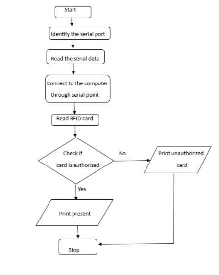 Checkifcardisauthorized:Thesystemwillthencheckifthe ID number of the RFID card is authorized. If the card is authorized,thefollowingstepwillbeinitiatedbythesystem. If the card is not authorized, the system will print an unauthorizedmessageandstoptheprocess.