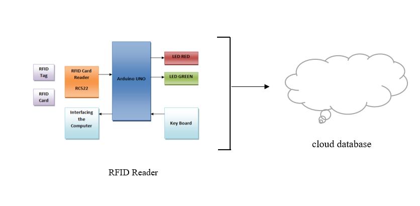 TheabovediagramdisplaysablockschematicofanRFIDbased attendance monitoring system. The system uses an RFID reader to read the ID of an RFID tag attached to an student’s ID card. The reader then sends the ID to an ArduinoUnomicrocontroller,whichcommunicateswitha computer.ThecomputerstorestheIDinaclouddatabase.A keyboardisfurthermorelinkedtothecomputer,whichcan be used to add or remove employee IDs from the system. Thistypeofsystemcanbeusedtotrackstudentattendance, aswellastocontrolaccesstorestrictedareas.Herearesome