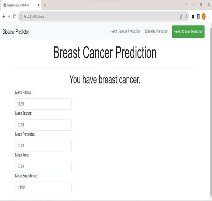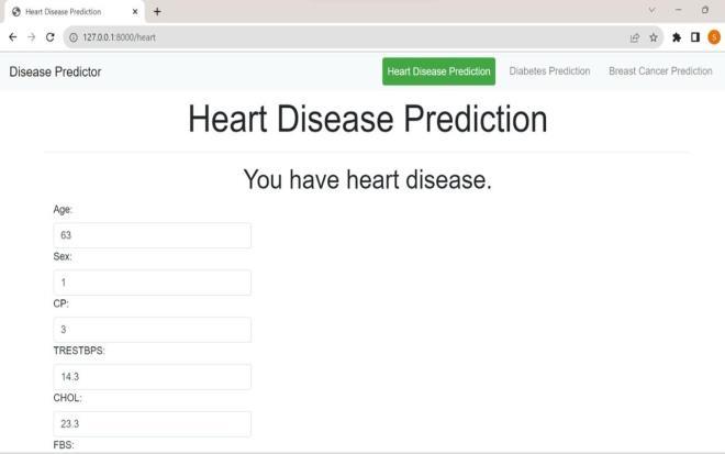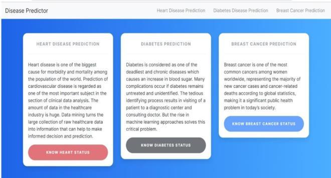 In contrast, our proposed system offers a more versatile approach.Usersofourmulti-diseasepredictionsystem can conveniently assess several diseases on a single webpage. They no longer need to navigate multiple platforms to determine whether they might be affected by a particular illness. To utilize this comprehensive disease prediction system,userssimplyneedtoselectthenameofthedisease of interest, input the relevant parameters, and click the "submit" button. The system will then invoke the appropriate machine learning model to forecast the outcome and display the results on the screen. This integrated approach streamlines the process for users, providingamoreuser-friendlyandefficientexperience.