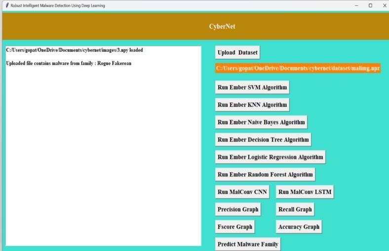 The two pictures display the user interface of 'CyberNet' a cybersecurity software.In theimagelabeledasFig;3 there are predictions of types of attacks shown on the CyberNet interface probably related to uploading datasets. The second image, in Fig; 3 exhibits a file dialog box and a confirmationmessageonCyberNetconfirmingafileupload. Each illustration represents a step in the process of inputting data into the system for analysis offering options to execute algorithms and visualize outcomes. This layout simplifies user engagement, for data handling and security assessment.