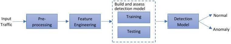 with 'Input Traffic,' where raw data is collected. This is followedby'Pre-processing,'wherethedatais cleanedand formatted. Next, 'Feature Engineering' is applied to extract relevant characteristics from the data. The 'Training' stage involvesdevelopinga model usingtheengineeredfeatures. 'Testing' then assesses the model's performance. The 'Detection Model' stage involves the model's actual deployment, where it classifies new data as 'Normal' or 'Anomaly.' Finally, an actionis taken based onthedetected anomalies.
