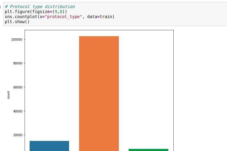A bar graph has been included below to illustrate the distribution of protocol types within a given dataset. Notablythedominantorangebarsignifiesaprevalenceof oneprotocoltypecomparedtothefrequenciesrepresented by blue and green bars. This graphical representation servesasasummaryofprotocolusagetrendsthatmirror network traffic patterns or cybersecurity data, within the observeddataset.