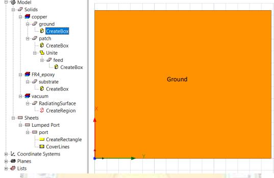 Step 1: creating a ground plane Material: copper Positions: 0,0,0 X size: length of the substrate Y size: width of the substrate Z size: height of the patch