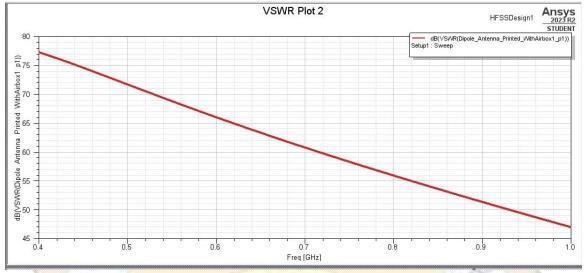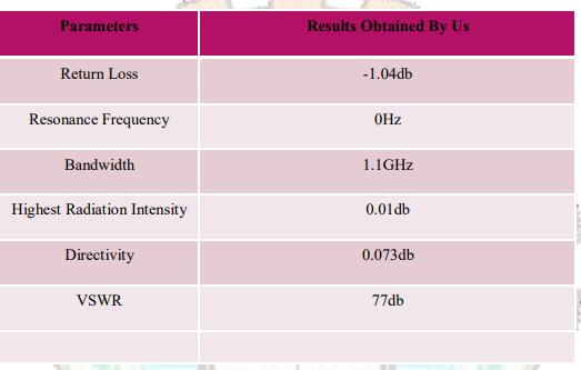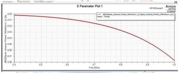 Based on the outcome of the simulation, it was concluded that the parameter was correct. For mobile and wireless technologies,thebasicvalueis -1.04dB,whichisidle.For optimal operation, the antenna is set to the necessary frequency. The S11 parameter characterizes the return loss of the planned antenna, and the frequency of operationis1.1GHz,asshowninthepicturebelow.Return loss'svalueis