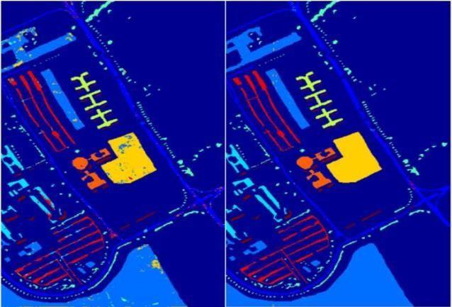 Fig. 12.ClassificationmapsfromtheproposedDRBRESNETandthebaselinesontheUniversityofPaviaData (a)SSUN:99.45%.and (b)DRB-RESNET:99.63%.