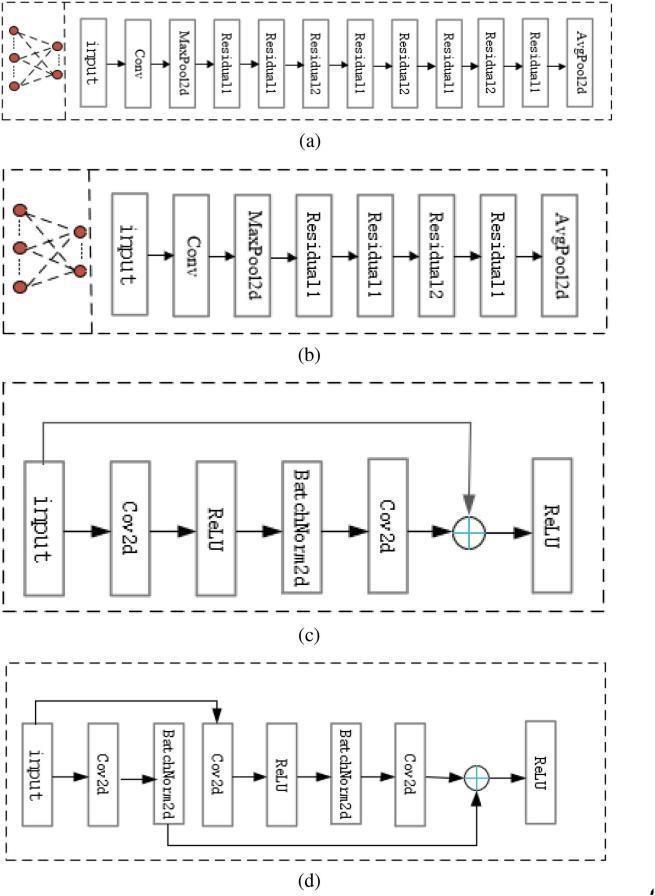 Fig. 4. DRB-ResNetstructureandresidualblock structure.(a)DRB-ResNet(11).(b)DRB-Resnet(7).(c) Residualblock1.(d)Residualblock2.
