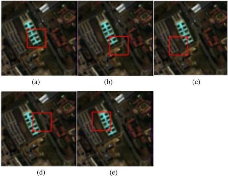 dimensionality reduction, each pixel designated for classification undergoes segmentation, wherein a small area of 11×11 centered around the pixel is extracted. Subsequently, these segments are repositioned within a square bounding box, ensuring that the pixels to be classified occupy the upper-left, upper-right, lower-left, and lower-right corners of the box, along with the inclusion of the initially extracted global block. This approach facilitates the extraction of spatial information fromhyperspectralimaging(HSI)data.Forregionalblocks indifferentdirections,moredetailedspatialrelationships canbeobtained,andeventhedissimilaritiesorsimilarities between different categories shown in the Fig. 1(a) indicates the global segmentation area of the pixels to be classified,Fig.1(b)indicatesthatthepixelstobeclassified areintheupper-leftcorner ofthesegmentationarea,Fig. 1(c)indicatesthatthepixelstobeclassifiedareplacedinthe upper-right of the segmentation area corner, Fig. 1(d) indicates that the pixels to be classified are placed in the lower-leftcorner,andFig.1(e)indicatesthatthepixelsto be classified are placed in the lower-right corner of the segmentationarea.