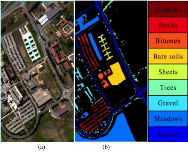 Fig. 6. Forexperimentaldatasets. (a) False-colorimage oftheUniversityofPaviadata.(b)Groundtruthofthe UniversityofPaviadata.