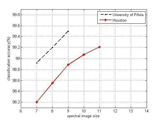 8. Classificationaccuracy(%)ofthreedatasetsat differentspectral imagingsizes.