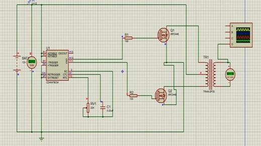 The total design consists of IC- CD4047, Battery, Resistor, Capacitor, MOSFET, and Step-up transformer. Battery suppliessteady12VDCvoltage,TheIC-CD4047isonekind ofastablemultivibrator.Thisrequiresanexternalresistor andcapacitor.IChelpsingeneratingsquarewavepulsesof nearly50HzwhichwillbeusedtoalternativelyswitchON oneoftheMOSFET[12].ThesepairsofMOSFETsserveas electricalswitchestodeliverDCatonepolarityandthenthe oppositepolarity,generatingasquare waveACwaveform [13].Atlast,thesquarewaveform’samplitudegetsincreased bythestep-uptransformer230v/50Hz[14].