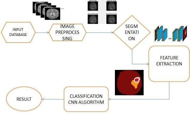 The proposed system has mainly five modules. Dataset, Pre-processing, Split the data, Build CNN model train Deep Neural networkforepochs,andclassification.WecantakenumerousMRIpicturesfromthedatasetanduseoneofthemastheinput image..Inpre-processingimagetoencodedthelabelandresizetheimage.Insplitthedatawesettheimageas80%Training Data and 20% Testing Data. Next, construct a deep neural network model for CNN epochs. Next, the image was classified as either yes or no. If the tumor was positive, the response was yes; if the tumor was negative, the response was no.