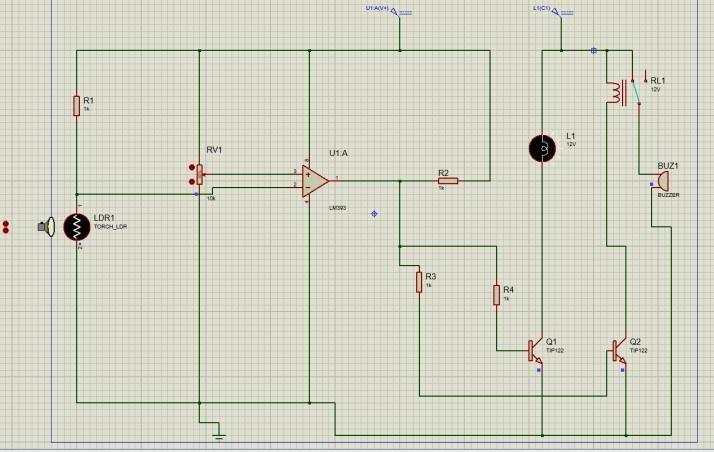 2: - When someone crosses the torch beam light the LED glows and the switch get closed, gives an alerting sound.