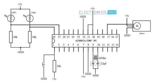 The Sun tracking solar panel consists of two LDRs, solar panelandaservomotorandATmega328Microcontroller. Two light dependent resistors are arranged on the edges of the solar panel. Light dependent resistors produce low resistance when light falls on them. The servo motor connectedtothepanelrotatesthepanelinthedirectionof Sun. Panel is arranged in such a way that light on two LDRsiscomparedandpanelisrotatedtowardsLDRwhich have high intensity. When the intensity of the light falling on right LDR is more, panel slowly moves towards right and if intensity on the left LDR is more, panel slowly moves towards left. In the noon time, Sun is ahead and intensityoflightonboththepanelsissame.Insuchcases, panelisconstantandthereisnorotation.