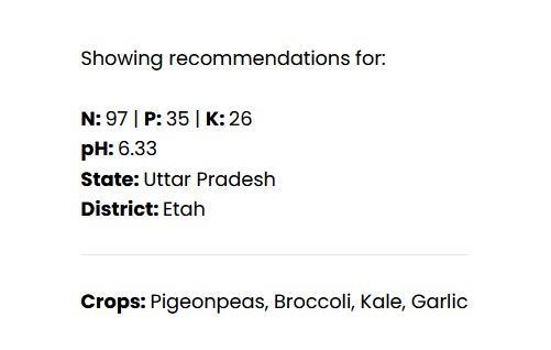 The user inputs the crop he wants with soil nutrients content and the location of field. Now, with the details of locationandcrop,variables‘a’and‘b’arefetchedfromthe dataset prepared and fertilizers are calculated and recommended.