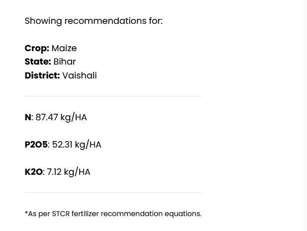 The fertilizer recommendation module utilizes STCR fertilizer recommendation equations for fertilizer recommendationsforthecropandareadetailsenteredby theuser.
