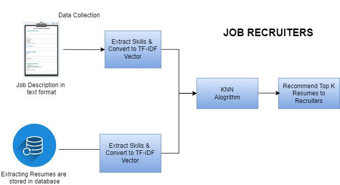 Figure 1 depicts the overall system architecture of the proposed system. The system architecture comprises three phases: User Login, Admin Login, and Recruiters Login. Users access the system using their credentials to upload resumes for the Job Seekers Recommendation System. Resumes, typically in PDF or DOC format, are processed to extract and convert them into Term Frequency-InverseDocumentFrequency(TF-IDF)vectors. Simultaneously,jobpostingsarescrapedfromLinkedInor retrievedfromthesystem'sdatabase.Jobdescriptionsare parsed to extract skills, transformed into TF- IDF vectors, facilitating recommendation of the top K jobs to users using a and K-Nearest Neighbors (KNN) algorithm. Recruiters can upload job descriptions upon logging in. ThesedescriptionsareconvertedintoTF-IDFvectorsafter extraction.Resumesstoredinthedatabaseareanalyzedto extractskills,alsotransformedinto TF-IDF vectors.These components streamline the recommendation of the top K resumes to recruiters, aiding in efficient candidate selection. Admin login credentials provide access for editing and maintaining the database within the system forsmoothoperationandmanagement.