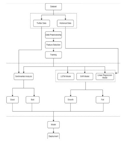 Thedataforourproposedmethodwillcomefromyfinance, whichisaninternetsource.Usingthepresentedapproaches, anassemblingmodel(i.e.,Linear,SVR,LSTM,andregression. The algorithms are selected based on how well they performed, as determined by the results of the literature review. Since stocks are thought to be a combination of linearandnon-linearity,several techniquesareapplied to improve accuracy. Sentiment analysis has also been conductedinconjunctionwiththismodeltotestpolarity.In additiontobeingmorebeneficialforSVM,wecanlearnfrom both positive and negative tweets, which can assist us in obtainingprofessionalguidance. International Research Journal of Engineering and Technology (IRJET) e-ISSN: 2395-0056