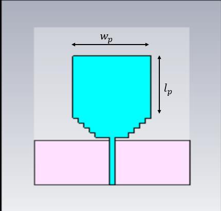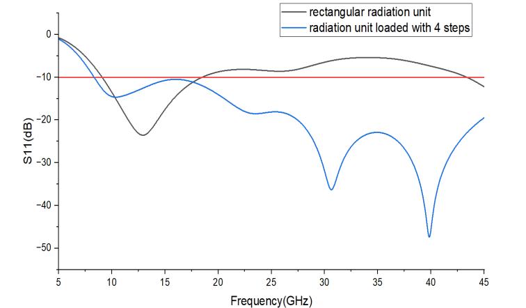 The ultra-wideband antenna described in this study functionswithinthefrequencyrangeof10GHzto45GHz. Achieving an ultra-wideband design for the microstrip antenna unit involves incorporating multiple steps on the rectangular unit. The multilevel stepped structure at the edge of the microstrip patch proves to be an effective method for expanding bandwidth, reducing size, and achieving ultra-wideband capabilities. As the strong current of the patch is mainly concentrated at the edge, modifications made at the edge significantly impact the currentdistributionoftheantenna,therebybroadeningits operationalbandwidth.