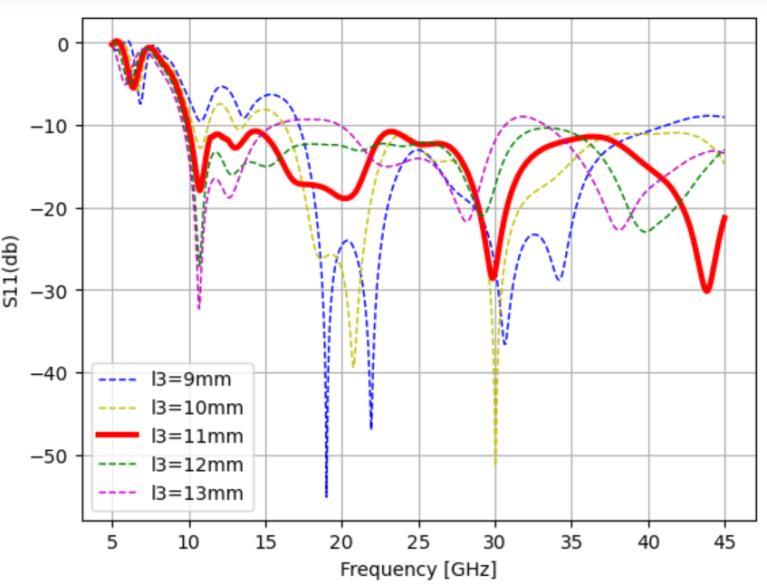 Figure 5 shows the change of resonant frequency and Sparameters of the antenna with the transverse spacing of the patch l3. With the increase of the spacing l3, each resonant point gradually shifts to the low frequency direction. Among which, the first and second resonant points tend to fuse. The S-parameter value of the third resonantpointgraduallydecreases.Thereturnloss ofthe fourthresonantpointisbetweenâ20dBandâ30dB.After extensive analysis, it was determined that the transverse spacingl3shouldbe11mmbecause,whenl3issmall,the antenna does not resonate in the frequency range of 10 GHzâ20GHzandtheimpedanceisnotmatched,andwhen l3islarge,thepatternispoor.Thewidthofthecorner-fed microstrip line was determined to be 1 mm, the length of theseries-fedmicrostriplinetobe5mm,andthewidthof the feed line to be 0.3 mm using the same method that wasusedtosimulatethetransversespacing.