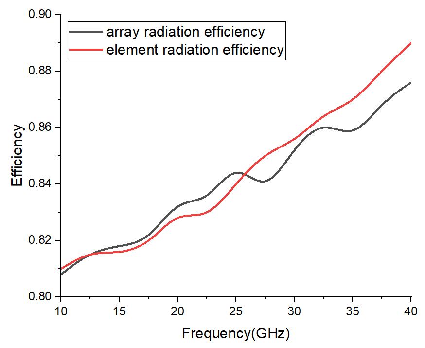 Figure8showstheradiationefficiencyoftheantennaunit andthearray,bothofwhichareintherangeof0.8-0.9.