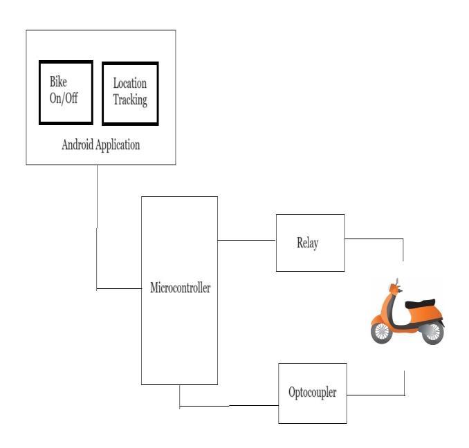 Anandroidappwillconsistoftwoways:onefordriver andoneforuser.Sothisappwillhaveoptionstocontroltwo wheelerthroughbuttonswithbikeOnandbikeOff.Alsoit willhavebuttonsforbuzzeron/offwhichwillhelptoprotect the two wheeler. We also have system such that if any accidenthappenstothevehicle,applicationwilldetectand willlettheuserknowifsomeoneisusingourvehicle.Even wecanhavesystemtodetectifuserhaswearhelmetornot. Ifuserhasn’twearhelmet,vehiclewillnotstartwhichwill helptheusertofollowrulesandbesafewhiledriving.