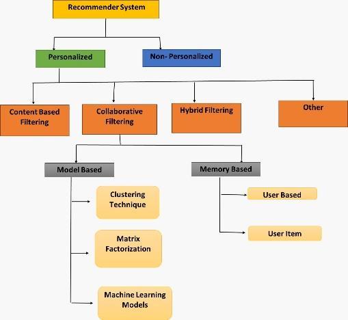 Collaborative Filtering (CF) produces personalized suggestions based on group user preferences, identifying patterns in actions and likes. It recommends services liked by users with similar interests, distinct from analyzing individual item content.Dividedintotwomaintypes.