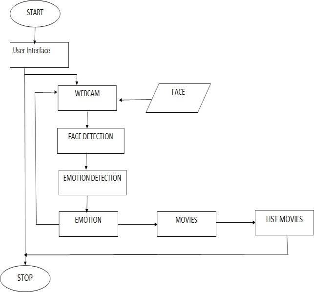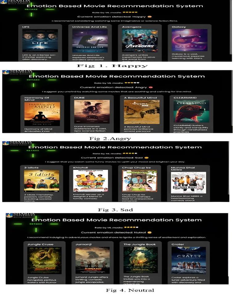 E. Emotion Detected: Once the emotion has been recognized, connect it to the appropriate movie categories using predetermined connections. For Example if you are feeling sad, this system will providesyoumoviesthatwillmakeyourmoodhappy. Ifyouremotionishappysystemwillprovidecomedy movies,adventuresmovies,romanticmovieslikethis.