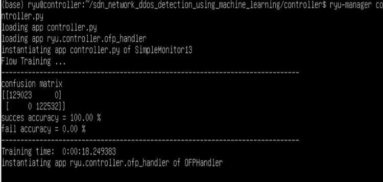 The controller executes a specific script, potentially named "controller.py," which houses a component called "SimpleMonitor13." This component trains a machine learning model using information about network flow. Thedisplayedresultsindicatethemodelachievedperfect accuracy in attack detection and then we use this data to mitigate the DDoS attack, meaning it correctly identified all instances without any errors. This suggests the model is ready for deployment within the SDN environment, where it could potentially collaborate with Ryu's OpenFlow capabilities to pinpoint and block malicious trafficduringaDDoSattack