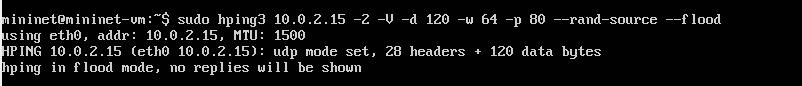 Hping3 is a python 3 command used for UDP flooding the networkwithsudomentioningtherootprivilegesthanhping command -1 denotes UDP command, -V for verbose, -d for data size, -w for window size, -p for packet size and randsourceforhidingyourIPaddress.