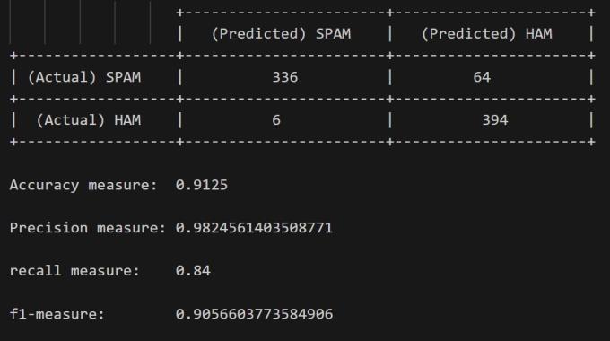The output is from a Naive Bayes classifier used for email spam detection. The confusion matrix shows the model’s predictions:336truepositives,394truenegatives,64false negatives, and 6 false positives. The accuracy is approximately 91.25%, indicating a high rate of correct predictions.Precisionisabout98.25%,showinga lowfalse positiverate.Recallis84%,indicatingthemodel’sabilityto find all positive samples. The F1 score, a measure of the model’soveralleffectiveness,isapproximately90.57%.The modeltendstopredictspamconservatively,leadingtomore false negatives than false positives. This approach reduces theriskofblockinglegitimateemailsbutallowssomespam emailstopassthrough