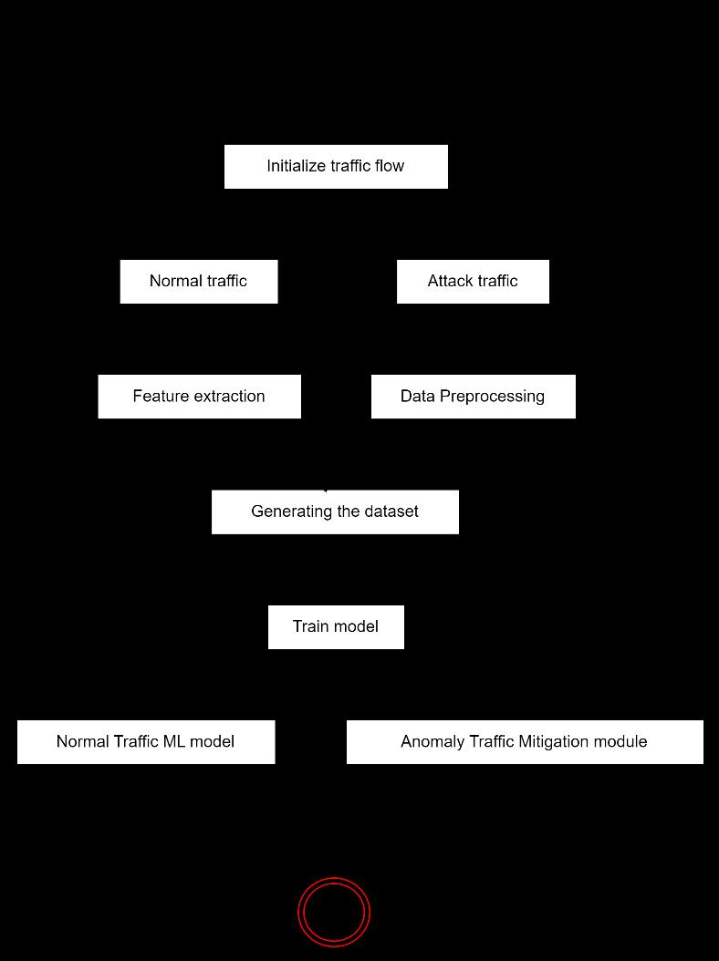 A dataset is generated from these processed data. This datasetwouldcontainfeaturesextractedfrombothtypes of traffics (or emails) and their corresponding labels (normal/attack or legitimate/spam). A model is trained usingthisdataset.ThiscouldinvolvealgorithmslikeSVM, KNN,DT,RF forDDoS detectionorNaiveBayesforemail spam classification. The choice of algorithm would depend on the specific requirements and constraints of the system. The trained model is then used to classify incoming traffic as either normal or an attack (or emails as either legitimate or spam). In the case of network traffic, there would be separate modules for handling normaltrafficandmitigatinganomalytraffic.